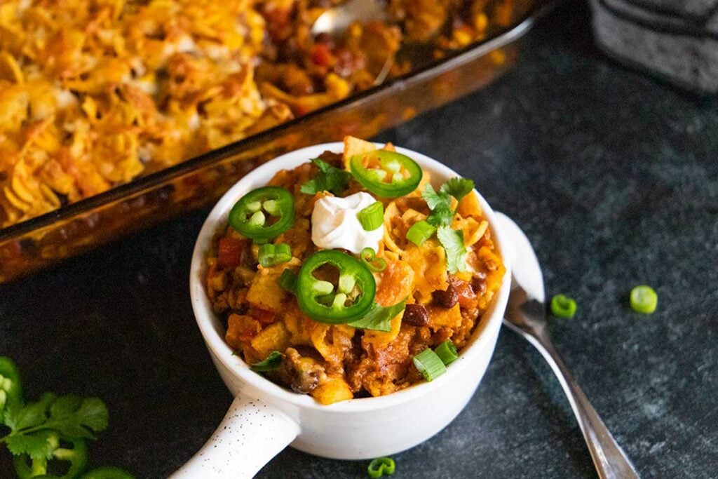 Crunchy corn chips, deliciously seasoned beef, and lots of cheese make this walking taco casserole a dish you will want to make time and time again.