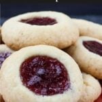 Thumbprint cookies are a soft, delicate, slightly crisp cookie base filled with sweet, tangy red raspberry jam!